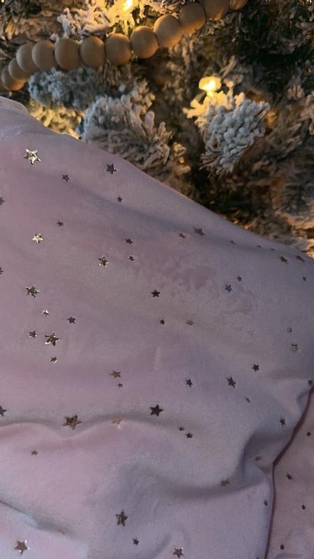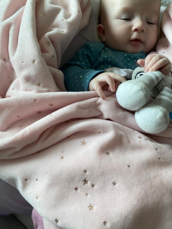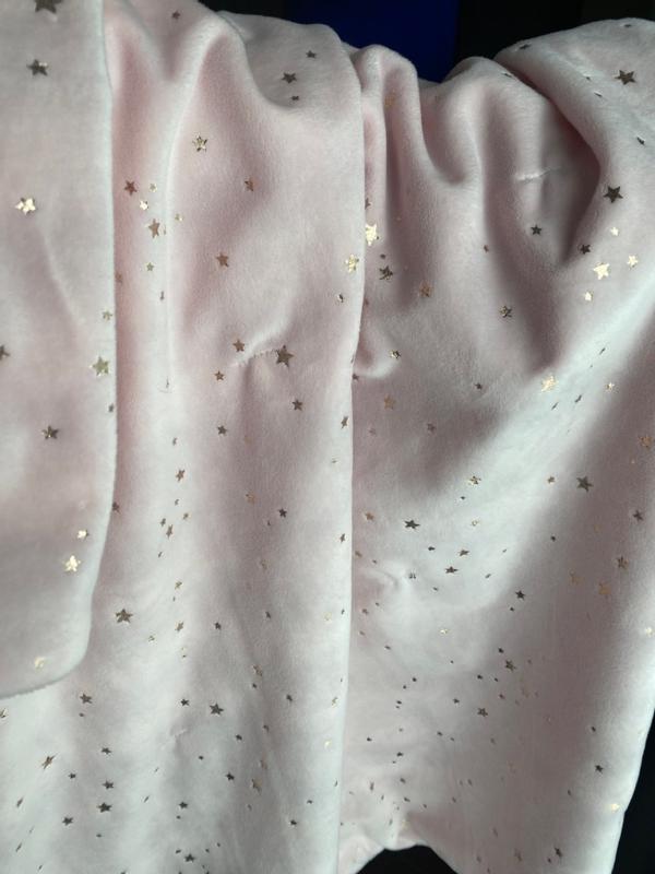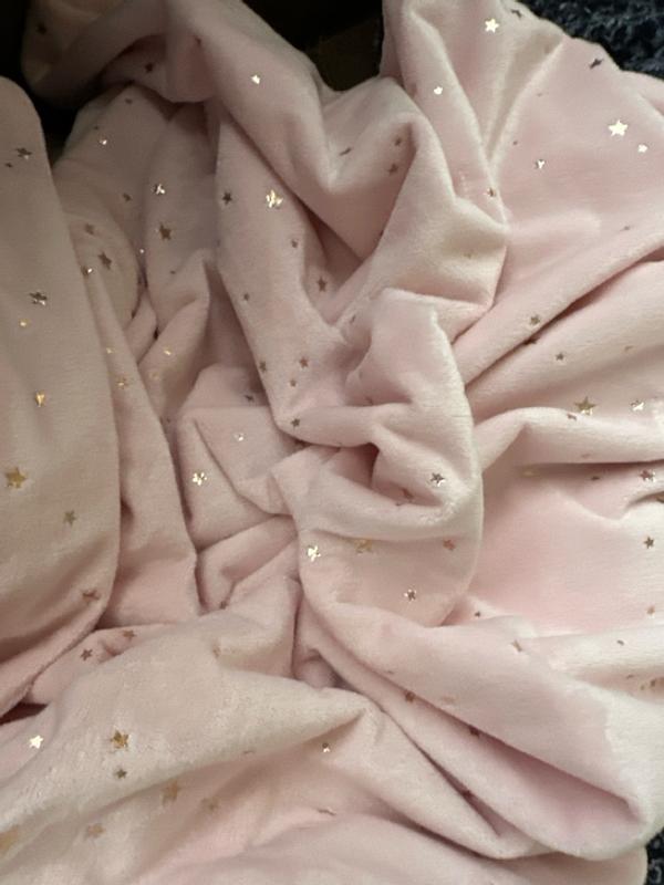 This blanket is so beautiful. It’s a soft pink with gold stars. Pictures do not do this blanket justice. It has a nice weight to it and keeps my baby girl warm. It has become my go to blanket because it keeps her warm and isn’t too bulky.