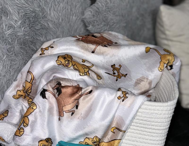 Absolutely amazing baby blanket! It’s soft and snuggly. My kids are already obsessed and carrying around the house everywhere. It’s fun that it has their favorite Lion King characters they know and love. Great size for the little ones. And nice soft material everyone will love. Gifted by Lambs&Ivy