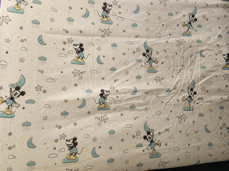 My toddler is obsessed with Mickey Mouse, so I was excited to get him this crib sheet. He loves the pattern; I think it’s really cute, too! I was expecting it to feel like cotton, but it’s a little more slippery in feeling than cotton.