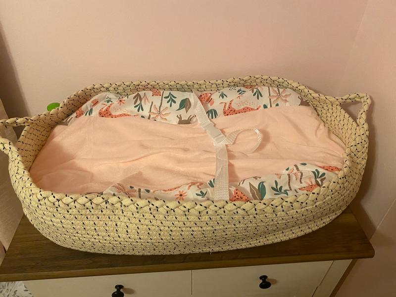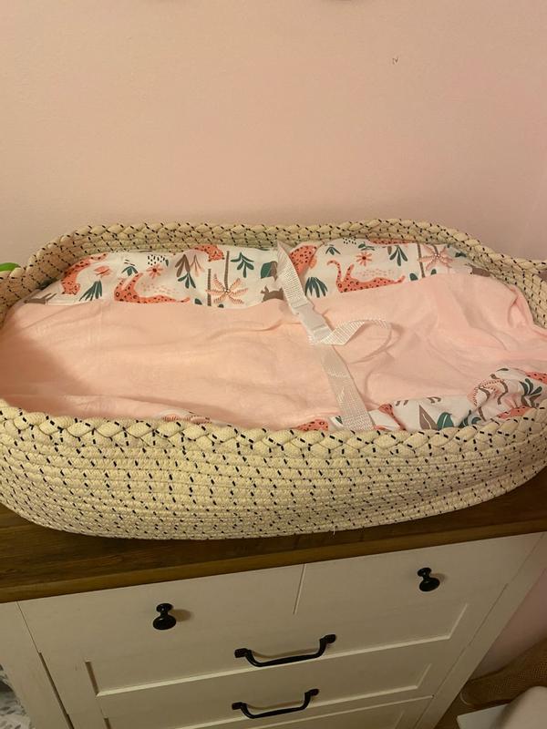 This changing cover fits good on the pad where I get my little one ready. It's a nice soft material and she is comfortable laying on it. It is pink and has a cute safari animals theme design. It's also easy to wash and clean.