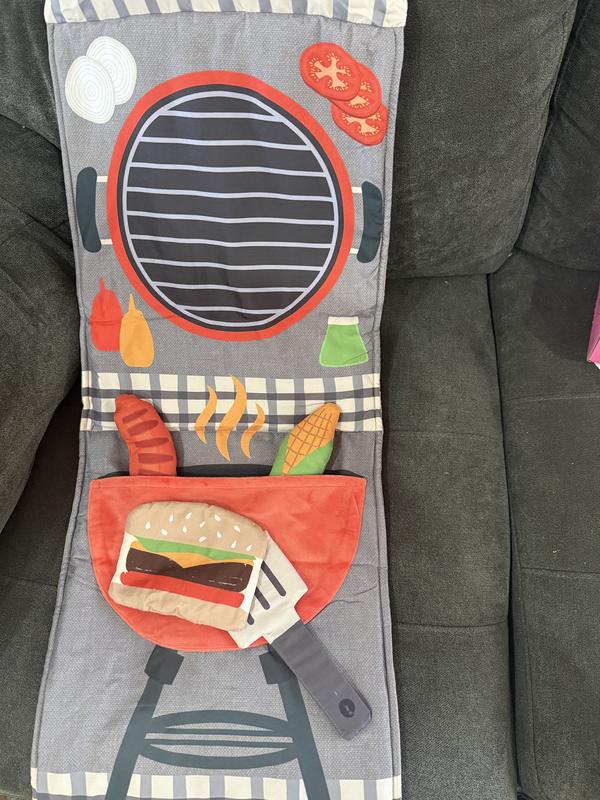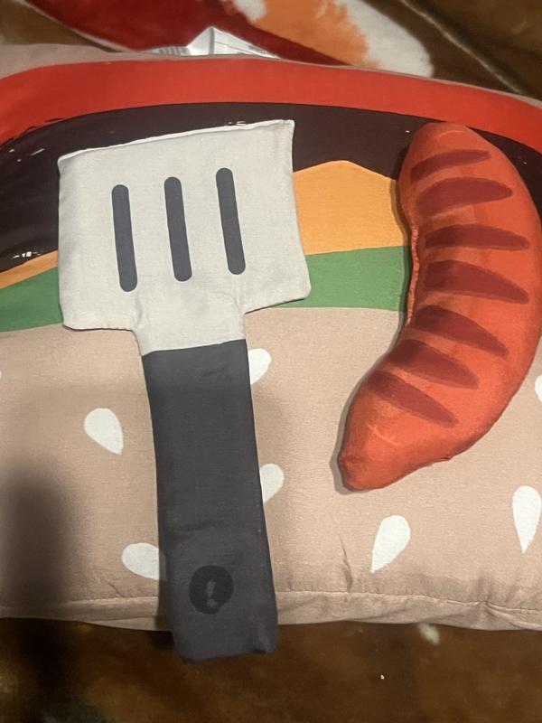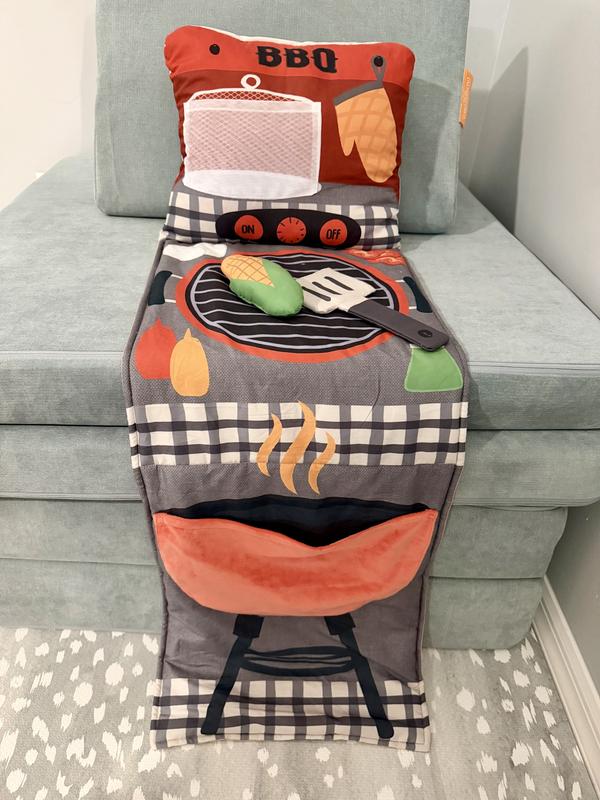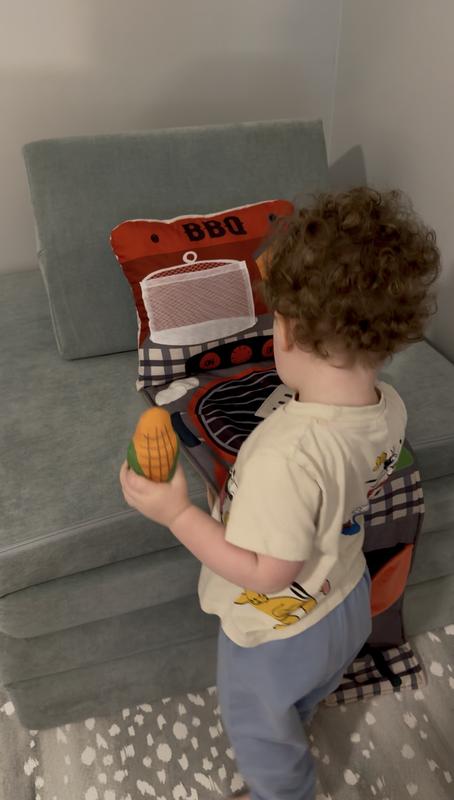 Complimentary from lambsivy This is such an awesome and unique toy. My son is just starting to get into pretend play. I love that this toy allowed me to introduce the concept without taking up a ton of space! I was able to put it on his play couch and play with him. When we were done, I folded it right back into itself and had a cute hamburger pillow! The little accessories fold into the pillow as well. It’s very well made and I love the thoughtful elements included like the spatula and diferent textures on the bbq. I could see myself getting more of these pillows in different themes because they provide such great value and don’t take up a lot of space!