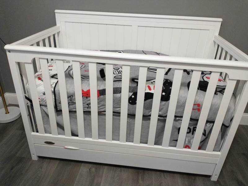 This 3 piece bed crib is so very cute! I absolutely love it. It looks very adorable in my little ones room. Its got just right in his crib. His theme is all matching. T hff e material is great. Not too rough. It is very durable.