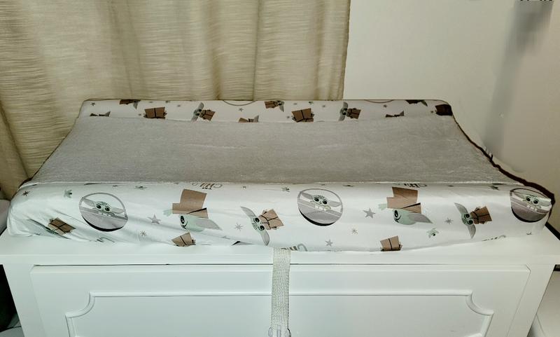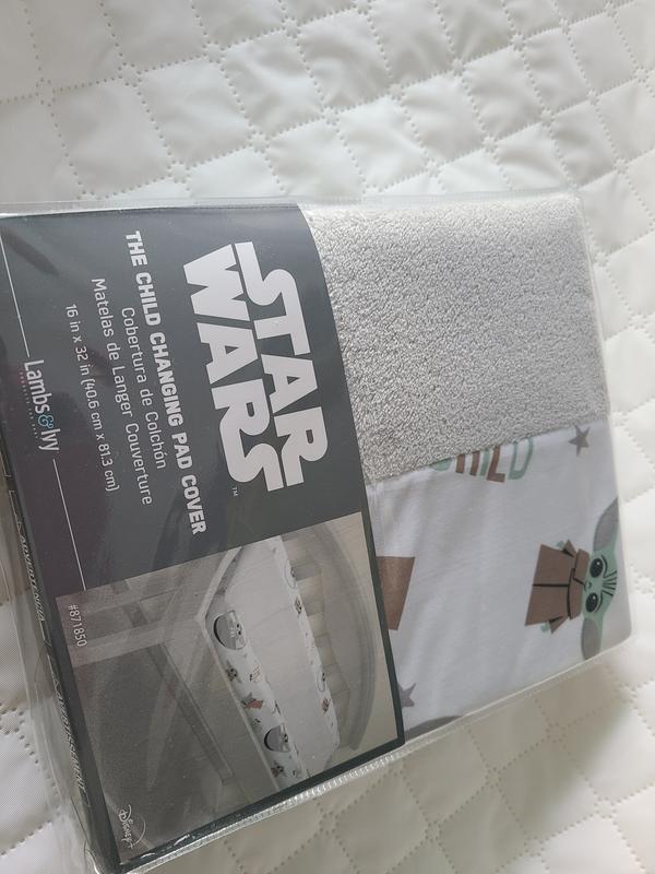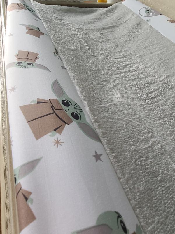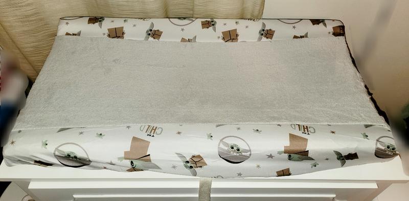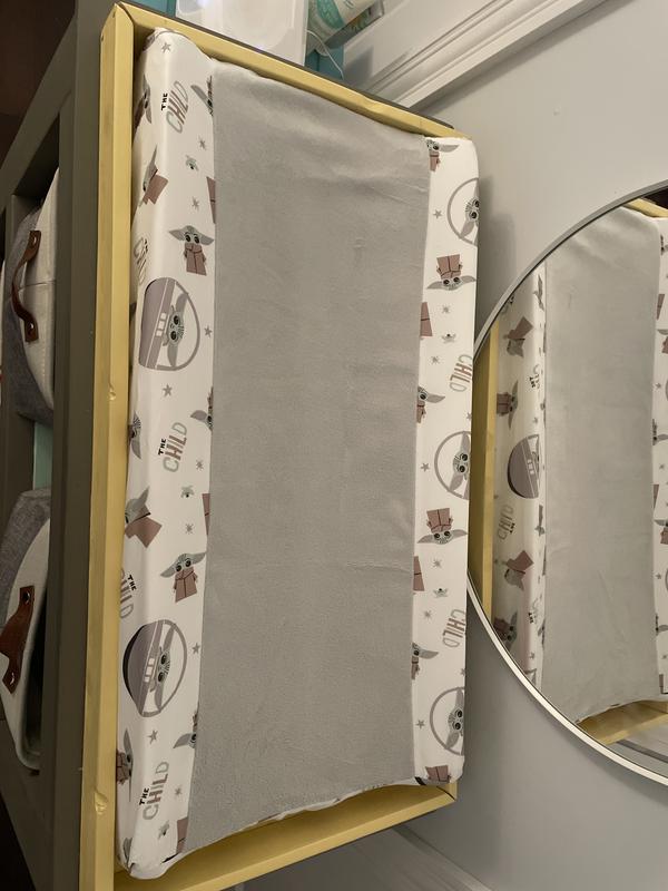 So cute! We absolutely love Star Wars and The Child so we were so happy to see this changing pad cover. Not only is it completely adorable, but the middle is minky soft and a little thicker than the rest providing more cushion for the baby when getting changed. It fits our contoured changing pad easily and has the strap holes. Also, it is machine washable for easy cleaning.
