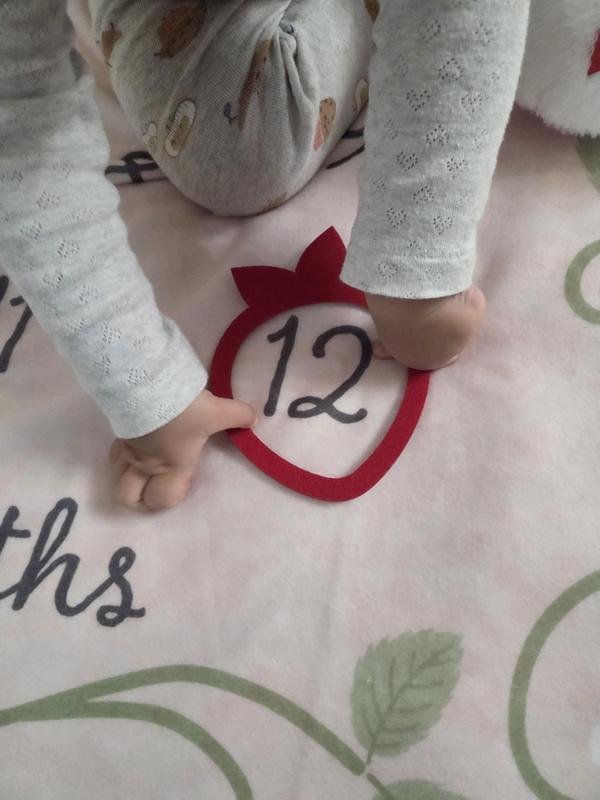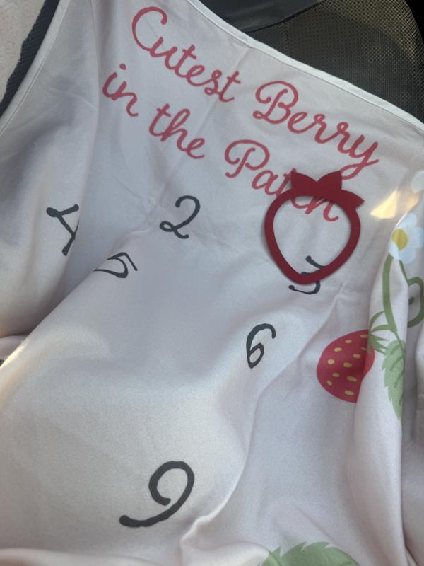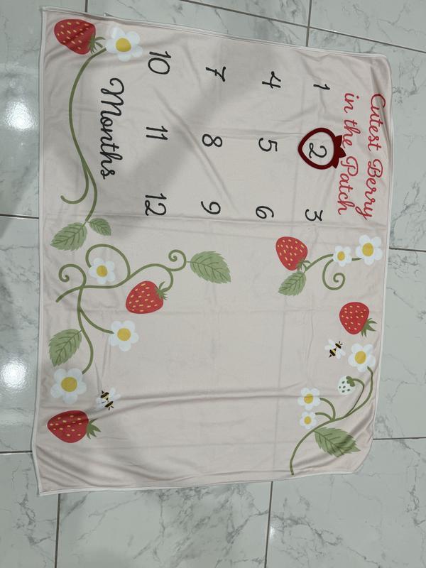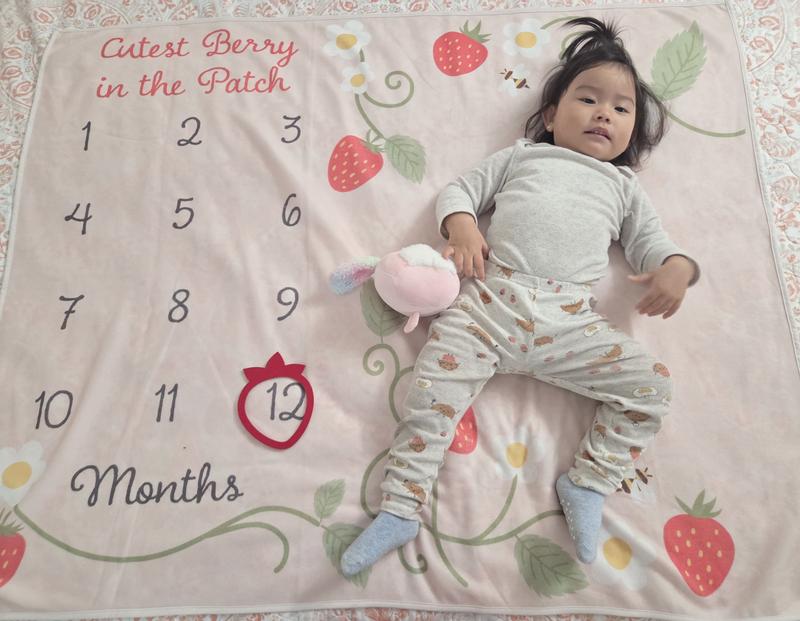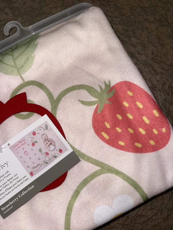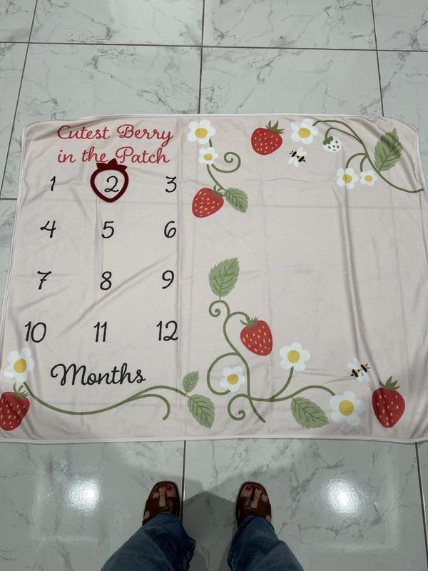 This is a fun baby milestones blanket, I love strawberries and pink so I adore this! The strawberry ring to denote the months is well made and the blanket itself is soft / cozy. I found that most blankets are flimsy but this one is sturdy and will look great for milestone photos.
