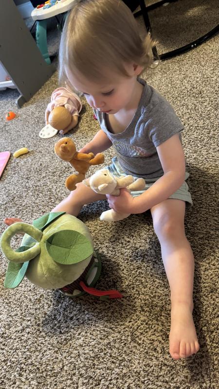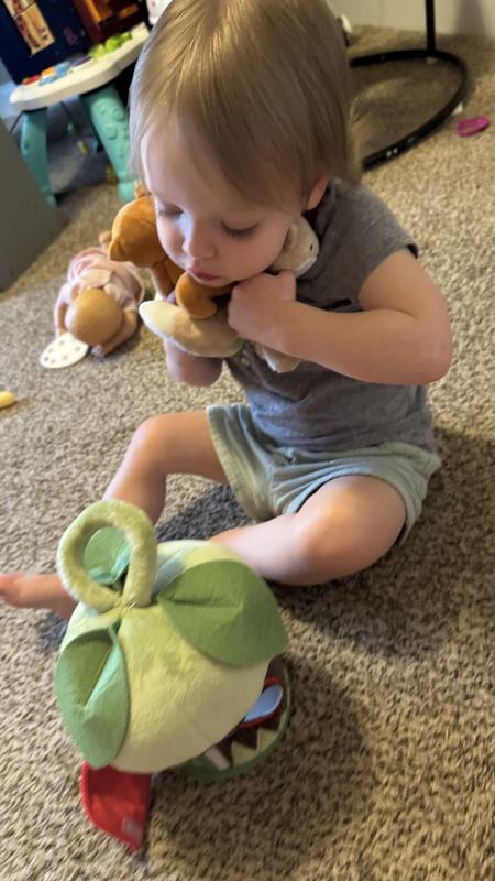 This Treehouse Plush Play Set Developmental Toy I received complimentary from Lambs & Ivy. This is a great toy for baby but also older toddlers. My 3 year old and 5 year old played with it for hours. It has multiple holes as well as 3 characters a snail, fox, and squirrel. The treehouse is adorable and sturdy and the ring on the top makes it great for little hands to tote around.