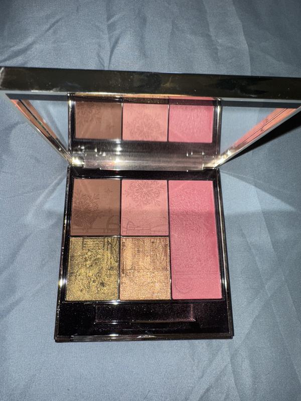 Gorgeous eye and face makeup in a delightful pink and gold packaging. This palette is perfect for the holidays or an evening out. The colors are one of a kind and flatter the eyes and cheeks. Blends seamlessly.