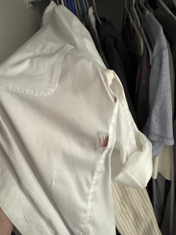Solid dress shirt but holes appear around lats from friction … Maybe that’s just the price you pay for cotton and not polyester