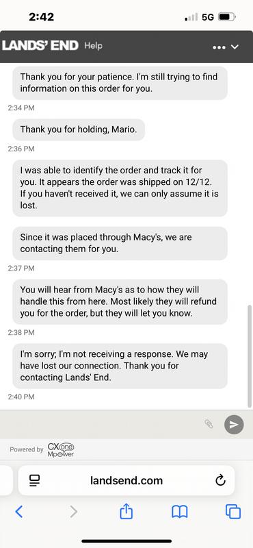 Called Macys they said call Lands End. I called Lands End they said call Macys. Order number 4691134030.