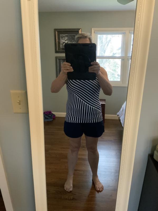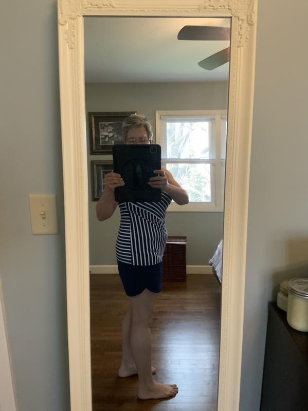I like the style of the swimsuit. The diagonal lines are as flattering as possible for my rounded shape, and the high neckline will protect the skin on my delicate upper chest area from the sun. I normally wear a 14P shirt and a 36B bra. I bought a 14P swim top; it is a bit roomy but fine. It was a bit longer than I thought a petite would be. I am 5'2", but it's fine. My only comment is that the suit is "sturdy" - fine for my 70+ age but may not be what a younger, slimmer person would like.
