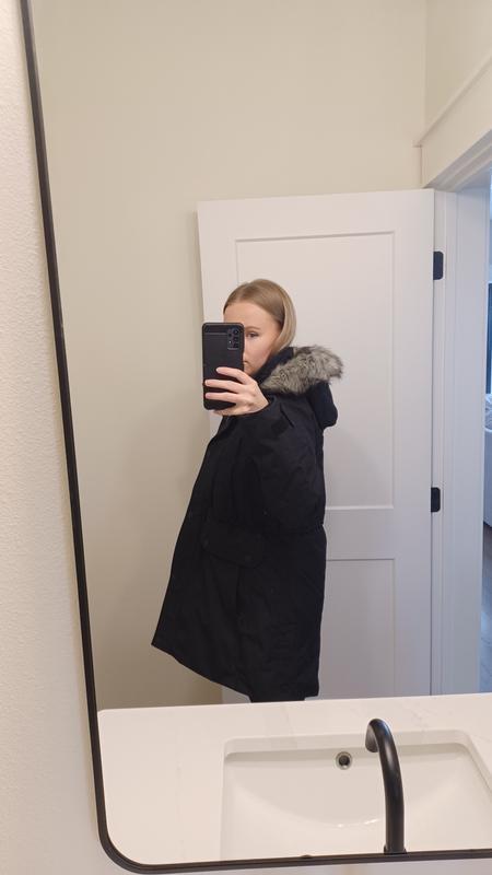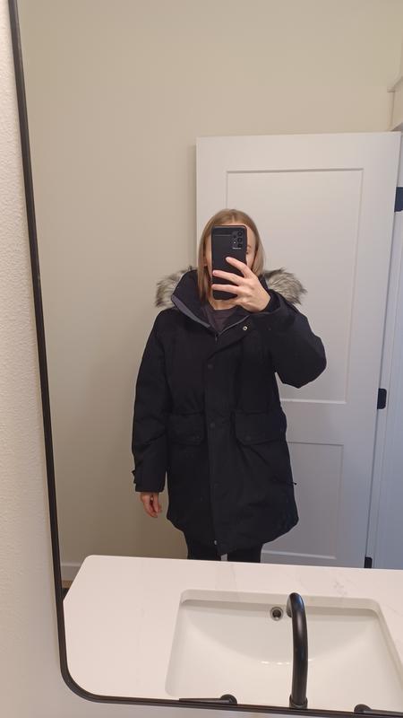 Purchased this coat in anticipation of a cold winter. This exceeds my expectations in every way. It’s stylish, much warmer than all of my NorthFace coats & sure to block the cold winter winds. I ordered an X-LG to accommodate sweaters but it fits snuggly without. The attached hood offers additional protection against the elements. Very pleased with this purchase!