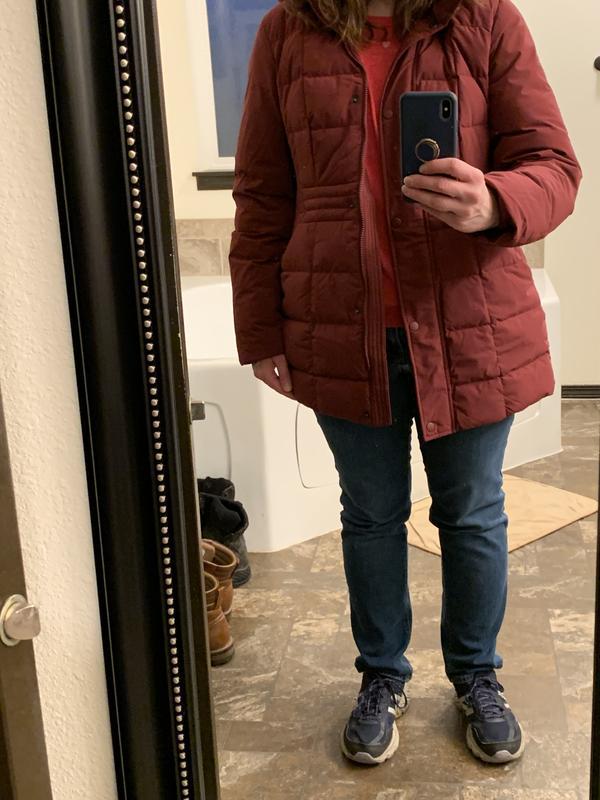 It’s a nice style and very warm. Too warm for me over 40 degrees but nice for colder weather. I like the “stretch” fabric. It seems sturdier than my last down coat which a dog scratched holes in trying to get a treat at the dog park. My only issue is with the zipper, which is very fidgety. I really have to try to get everything right so it will zip up. It seems like a bad design. Also I usually buy medium or large tops due to my hourglass figure (boobs and butt) but I got this in small and it fits perfectly.