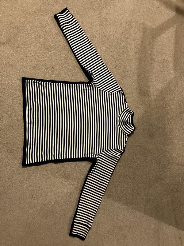 Bought one of these in navy It was a perfect relaxed fit This black/white striped version is 1inch shorter in body and sleeves. A tighter body fit - overall width is 3inches less.
