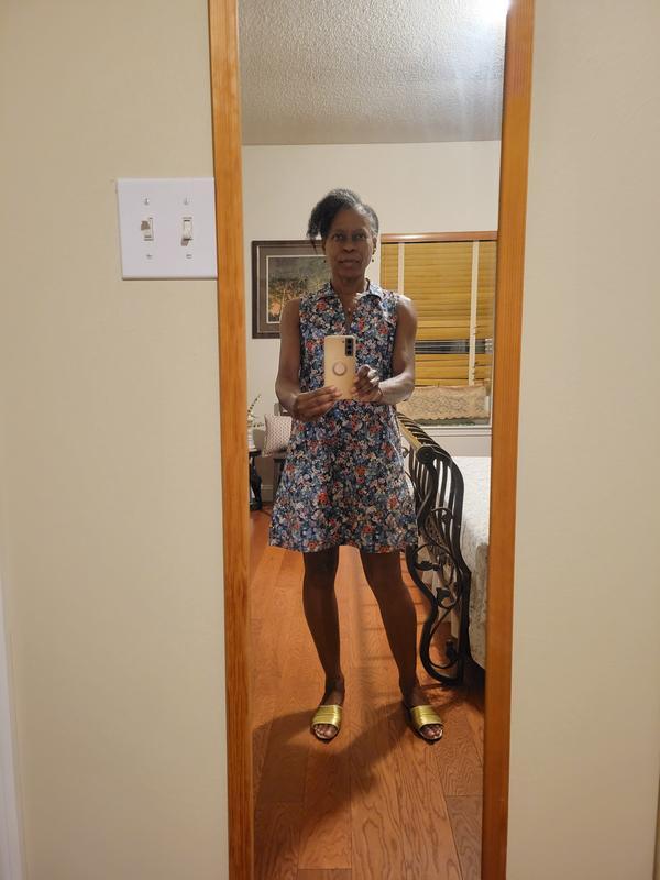 This sleeveless summer dress with a collar was perfect for going out to dinner . Casual, but dressy enough to wear to during a warm night on the patio.Very comfortable, nice floral print.