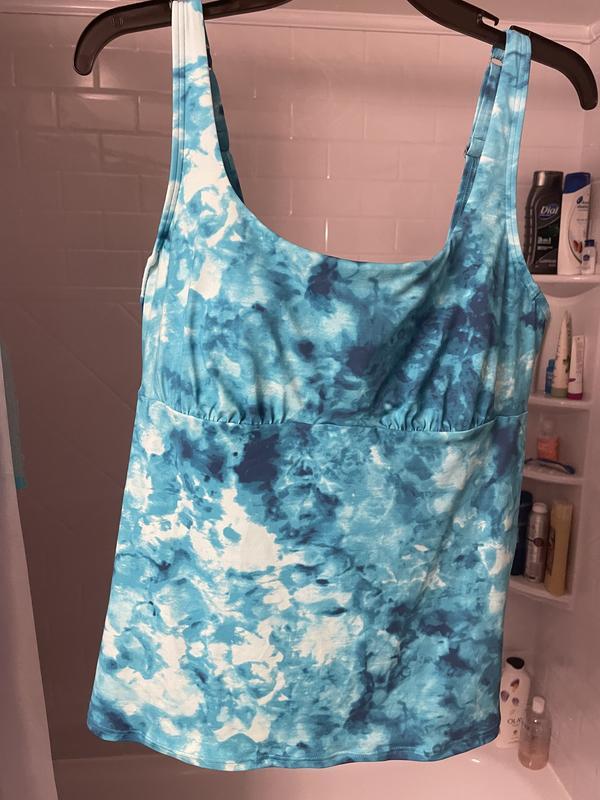 I have a very hard time with 1 piece suits because I have a long torso and tankinis are the perfect solution. This tankini top is very flattering, great at hiding imperfect tummies. I have it in several colors that I've bought over the years. I am a 36B, 5'3", 129 lbs and I got a size 8. It fits perfectly. The emerald color is beautiful.
