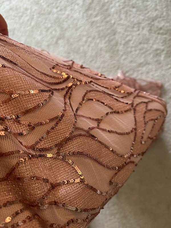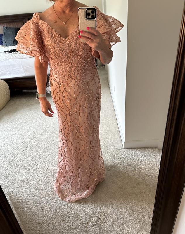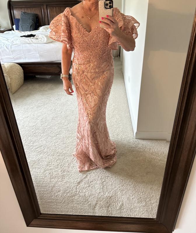 I had high hopes for this dress for my daughter's wedding but it was not meant to be. The color - rose pink is definitely more like a burnt peach. Pretty unattractive in my opinion. It did fit well, although after reading other reviews I ordered 2 sizes bigger (I am usually a 8-10 in a dress, with a 34DD chest and narrow hips. The size 12 fit my hips and waist but the bust would have had to be altered smaller as well as being hemmed). I didn't find the material to be "scratchy" as other reviewers have mentioned but I did find sequins from the dress all over my floor. Hope this review helps others in their decision making.