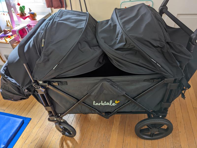 We love our Larktale. Our kids have long legs and this wagon provides ample leg space and their feet and knees don’t touch each other. Love the reclining seats and full canopy as our kids have fallen asleep, so we just gently recline the seat and pull down the canopy and they have a quiet and restful space right away. Love the padded 5 point harness as our youngest was able to ride very early due to the safe and secure seat belt. Only down side I could find is the harness is a little tricky to buckle at first but once you get the hang of it it’s easy from there. Folds up easily, super smooth steering even when full, great accessories (we purchased 2 canopies). We have taken this all over town, parks, zoo, science center, sports games. We were able to catch a great sale when we purchased ours. Highly recommend!