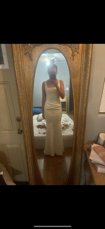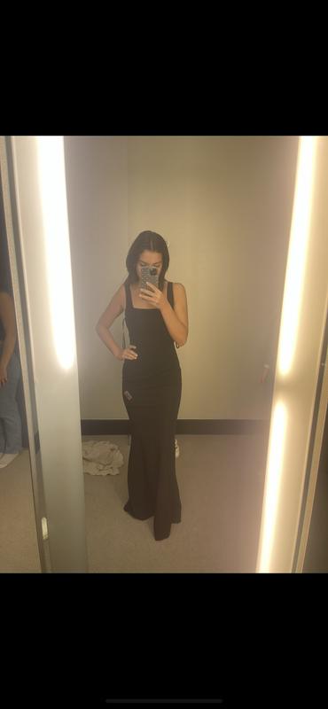 Pretty color. Runs a little tight in the hips. The square neckline is fabulous. A little plain for the event I need it for.