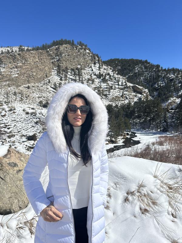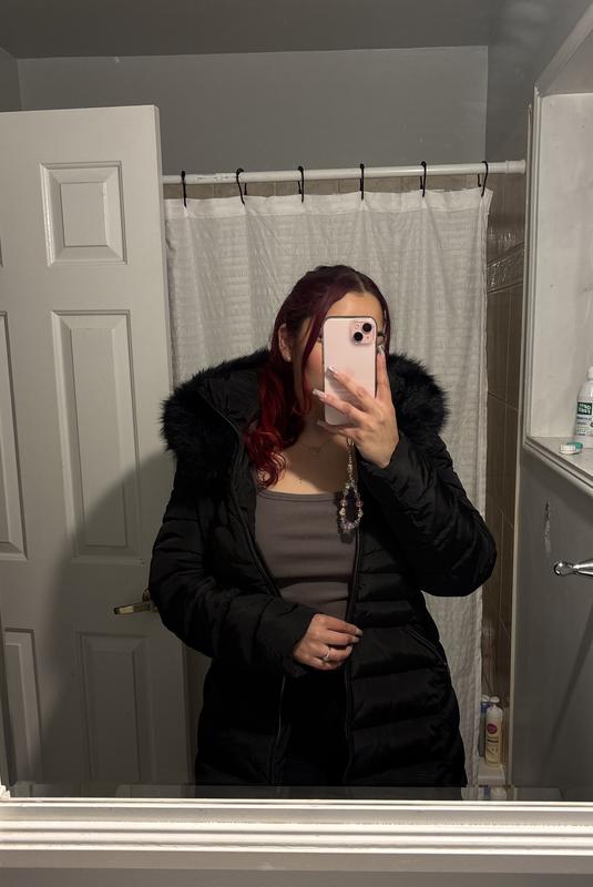 Fits like a glove, you can adjust at the waist too. The fur around your neck makes it look classy. It’s comfy and warm