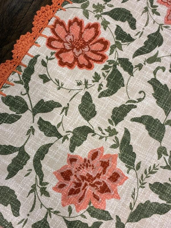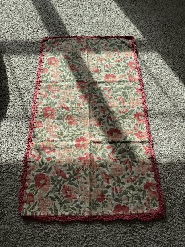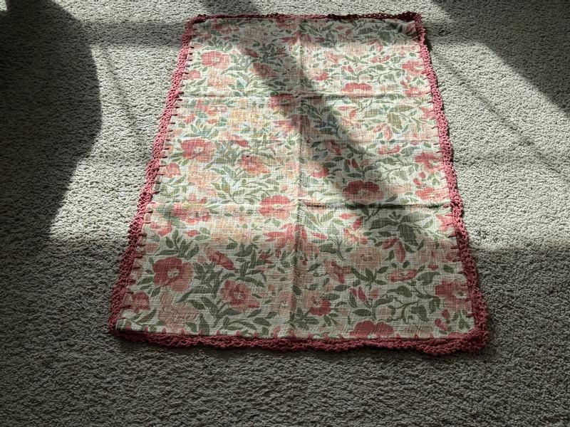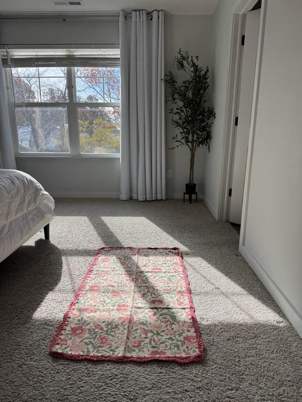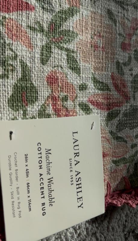 Beautiful Laura Ashley Cotton Crochet Border rug. Beautiful crochet work around the edge of the rug. Pretty pink Poppy Floral pattern. I love that it’s slip resistant and it’s machine washable. I used it by the bedside. Looks great!