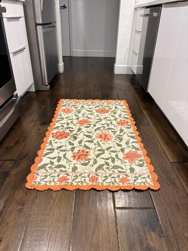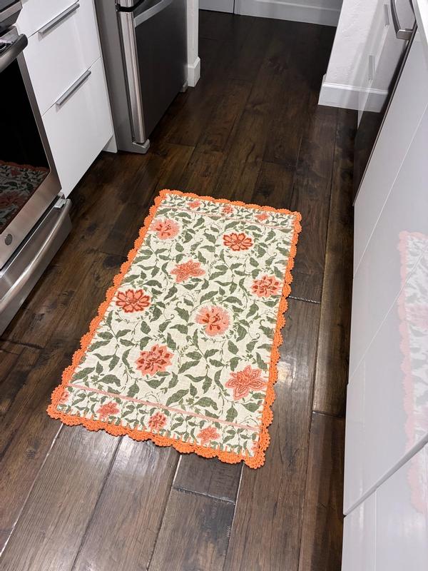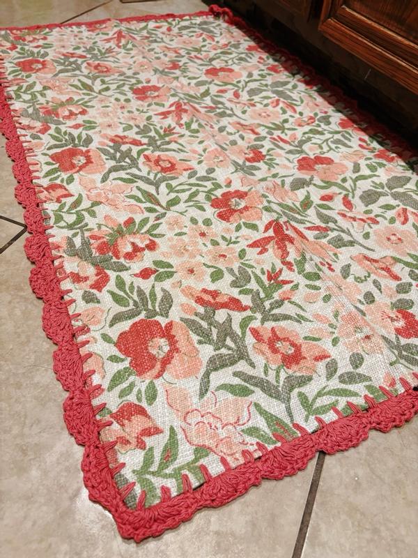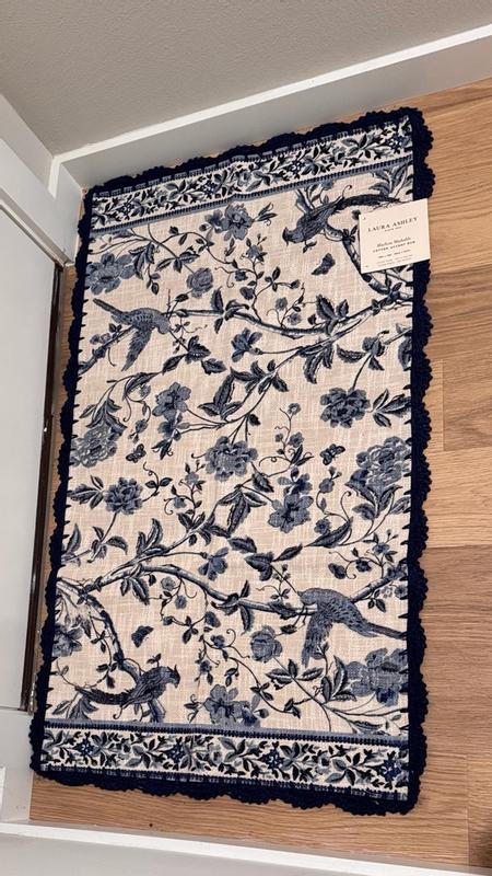 This cute Laura Ashley machine-washable cotton accent rug has been such a lovely addition to my kitchen. The beautiful floral design instantly adds warmth and color, and the delicate crochet border gives it a nice handcrafted touch. I keep it it placed right in front of my sink, and it’s surprisingly comfortable to stand on while cooking or washing dishes. The skid-resistant backing is a huge plus - it keeps the rug securely in place, even with constant foot traffic. Being machine washable I can clean it whenever it needs a refresh, and the best part is the color and the crochet edging looks great even after several wash cycles.