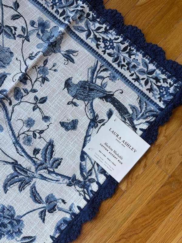 This adorable Laura Ashley Cotton Crochet Border Summer Palace Indigo Floral Machine Washable & Slip Resistant Accent Rug has transformed my space from dull and boring to bright and vibrant in an instant. With high-quality details, this timeless vintage-vibe rug is not only soft and beautiful but also super functional with its slip-resistant grip bottom and, most importantly, it is washable! Perfect for any hallway or entryway to add warmth and style to any space.