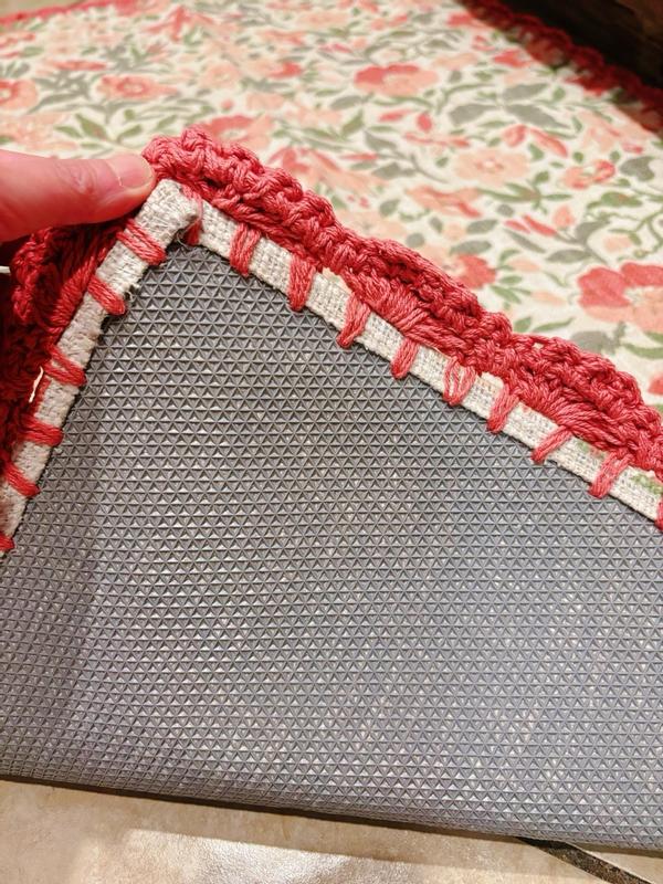 This is such a cute mat! The floral design with crochet borders give a warm and cozy tone. The mat itself is very thin but feels durable and it serves as a nice piece of decor in my rather mundane kitchen. The back has non slip grip. I have been using it for over a week now and confirm it doesn’t slide around, the slip resistant design is well done. So far I have seen no shedding after one wash.