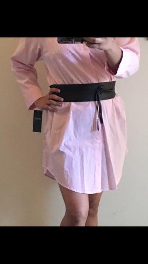 Wonderful look, fabric, fit. I am petite five 160 pounds. I went with a medium. I Also bought it in blue!