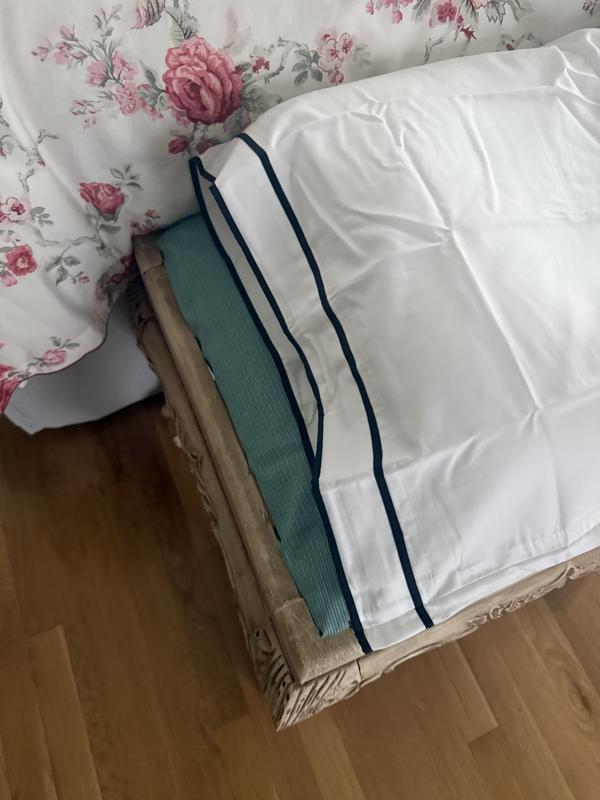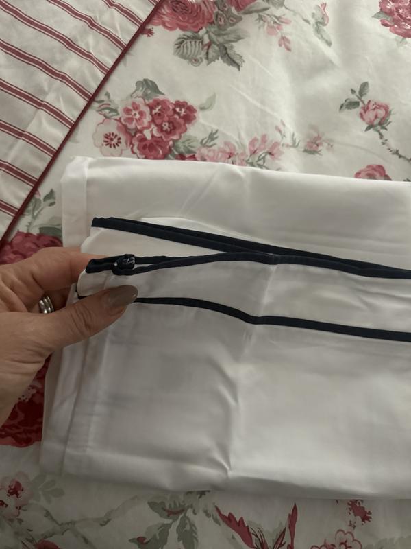 It is very stylish, soft and comfortable. I am getting the matching sheet set. The dark navy border adds a classy look to the pillow cases. I highly recommend.