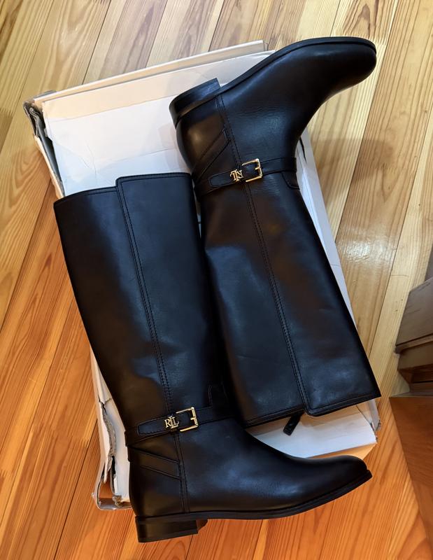 These boots are gorgeous. They are so comfortable to wear all day long. The leather is glossy but not shiny, and I love the gold hardware. I have another similar pair of RL boots that I have worn constantly for many years, so I know these new boots will serve me well for a long time.