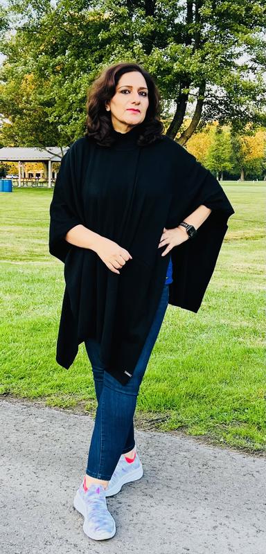 This poncho is light, warm and very soft. I love how it comes up around the neck. It’s great to pop on to take the dog for a walk or run errands when the temperatures are not quite low enough outside for a coat. Looks great with dress pants as well as jeans. I’m enjoying this poncho.
