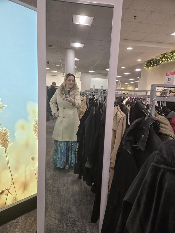 I went in to use Macy's gift cards and could not find anything I liked. Walked back by the coats and saw my coat and had to try it on. Could not believe how well it fit and it was half off. It was the only one there. I went to other stores and had to come back and get the coat. I was not in the market for one but this one really caught my eye. The quality is outstanding. Glad I returned for the coat.