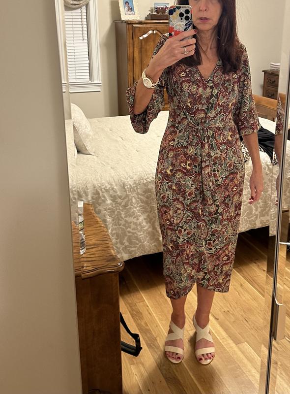 This dress looks much better in person than online. For reference, I’m 5’8, 130 lbs and pear shaped. I wear a size 4 or 6 depending on brand and style. The size 4 fit me perfectly and complimented my curves. I love the colors in this dress. The are “autumn” colors (wine, brown, sage, cream, rust) but can be worn in the fall and in the spring. Beautiful dress!