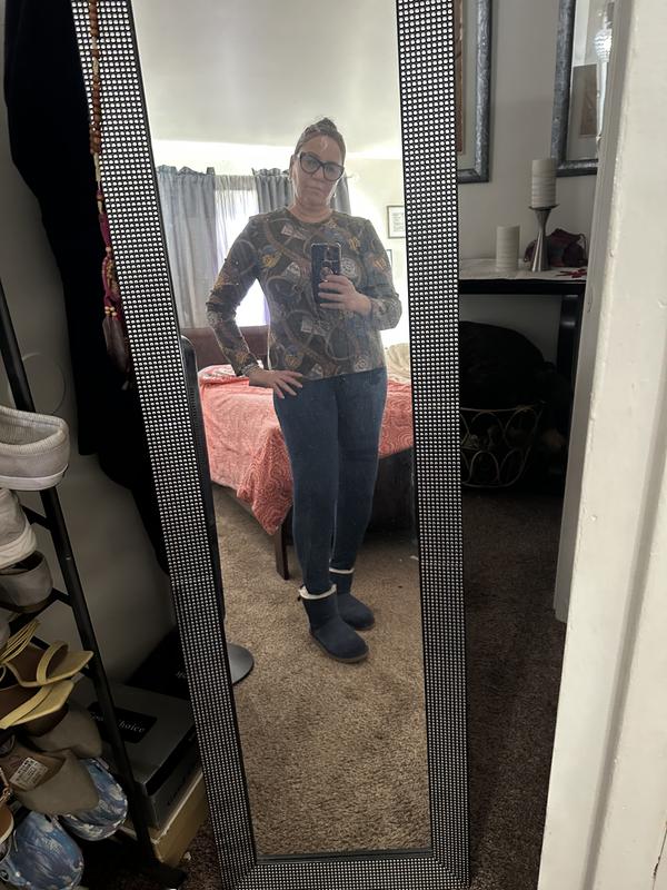 Flattering perfect fit, Fabric is top quality and true to form Ralph Lauren. The garment skims the body perfectly and can be worn with jeans The colors go well with cool and warm skin tones. I rarely wear brown and tans, but this top is great and complements my blue eyes.