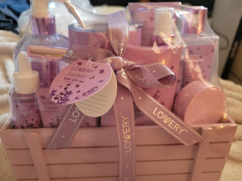 Lovery lavender home spa gift basket comes with a great assortment of goodies in a nice lavender colored wooden basket.It has bubble bath, shower gel, lotion, body mist,Shaving gel and razor, bar soap, bath bomb, and bath oil all tied up with a pretty ribbon! The lavender smells great and it’s a good way to relax and pamper yourself with a great assortment.