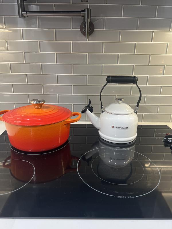 I am a huge le Creuset fan and this tea kettle complete my collection. It’s perfect the color white is so shiny really adds the touch my kitchen was missing and it heats up so fast.