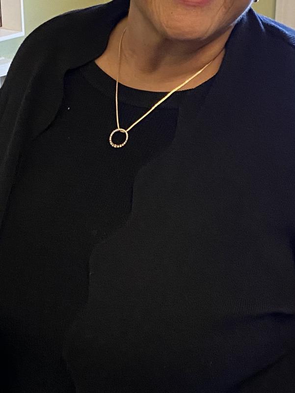 This pendant goes with everything, yellow gold or rose gold. I wear it working out and it to dinner dressed up. The sparkle on this piece is amazing.