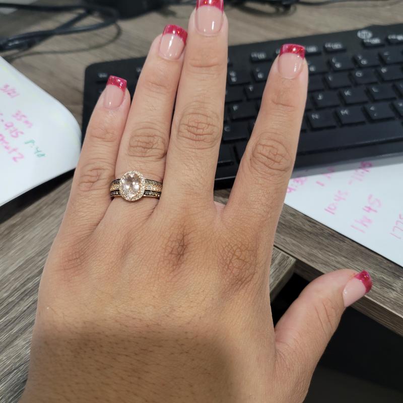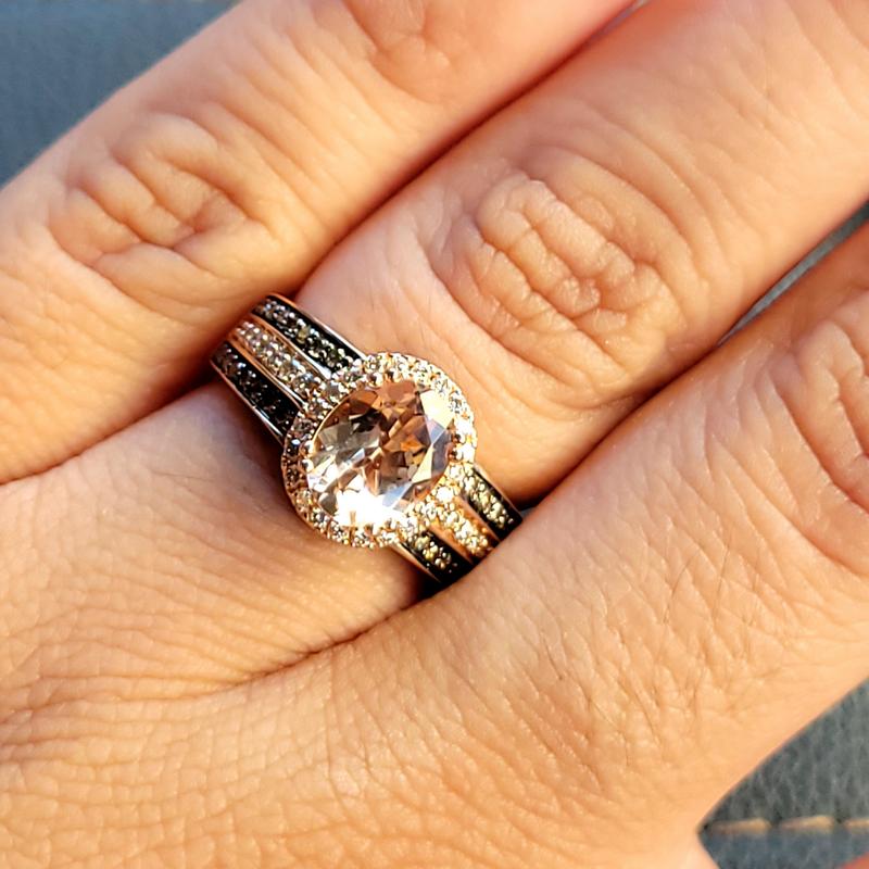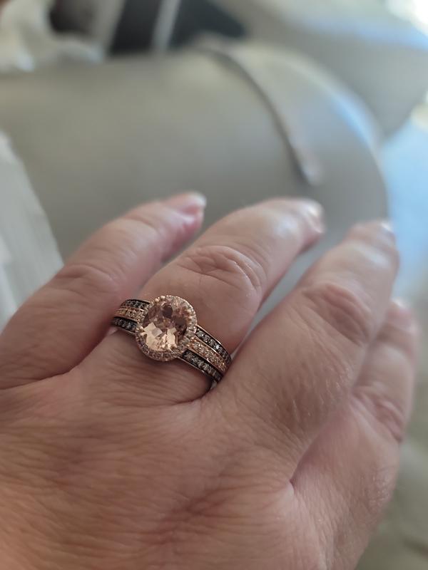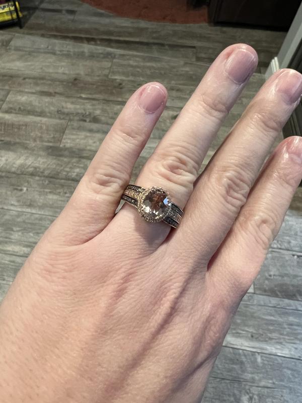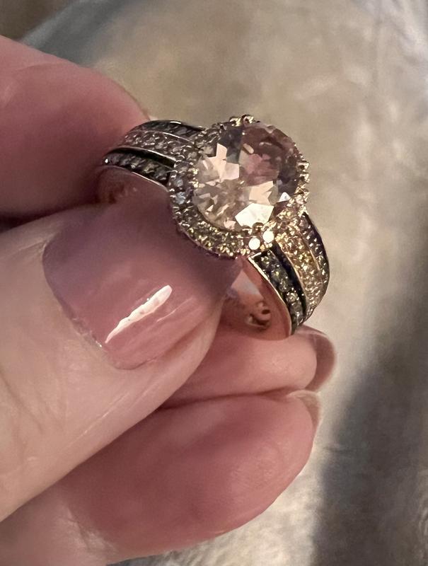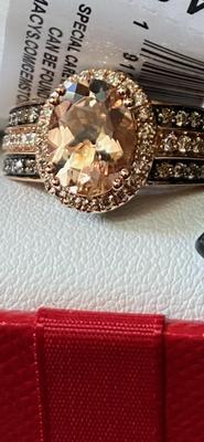 Purchased this for my wife. She loves it. It is a stunningly beautiful ring and worth the purchase. The morganite stone is clear and the perfect color for my wife. She loves the chocolate nd nude diamonds as well.