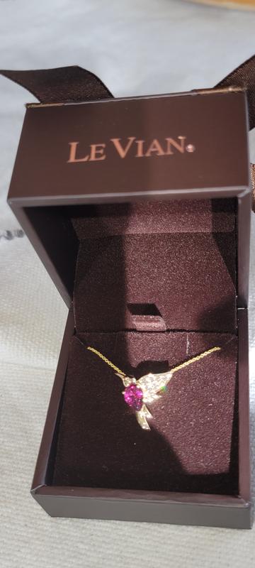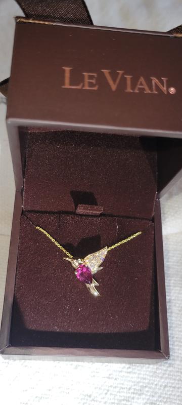 Chose this exquisite hummingbird necklace as a thoughtful gift for a lovely person who loves birds, nature and northern Minnesota. Her January birthstone is a garnet, making this piece extra special. LeVian and Macy's exceeded expectations. Ordered online and picked up in store. Gift arrived with signature LeVian brown velvet bowed box along with the certification paperwork. The sales person at Macy's Ann Arbor was wonderfully attentive and helpful.