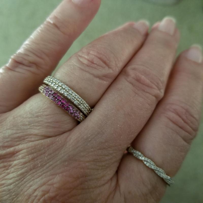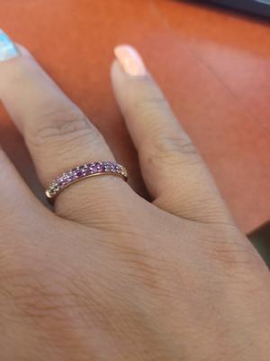 I love the color and have been wearing it as a stacking ring. Also bought the sapphire blue color.
