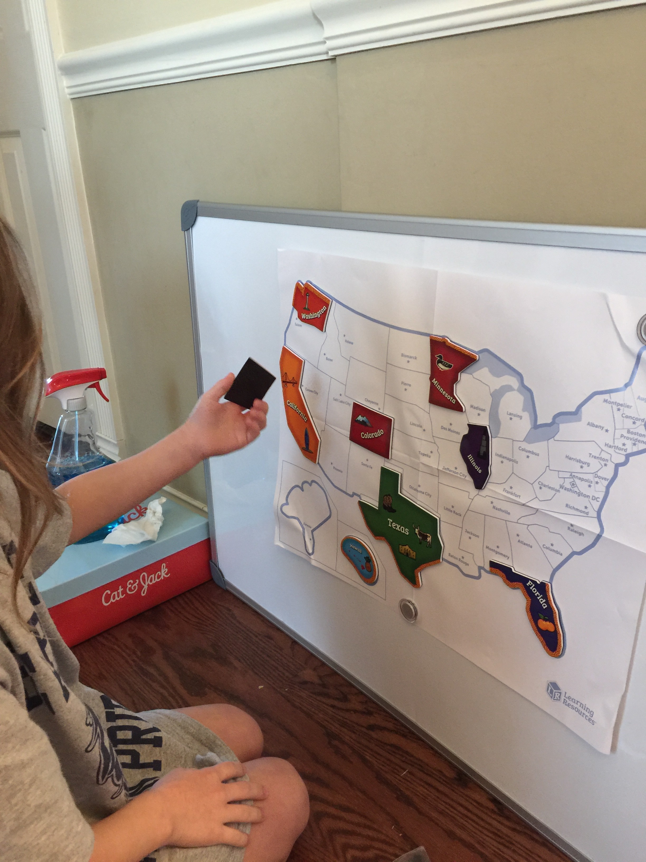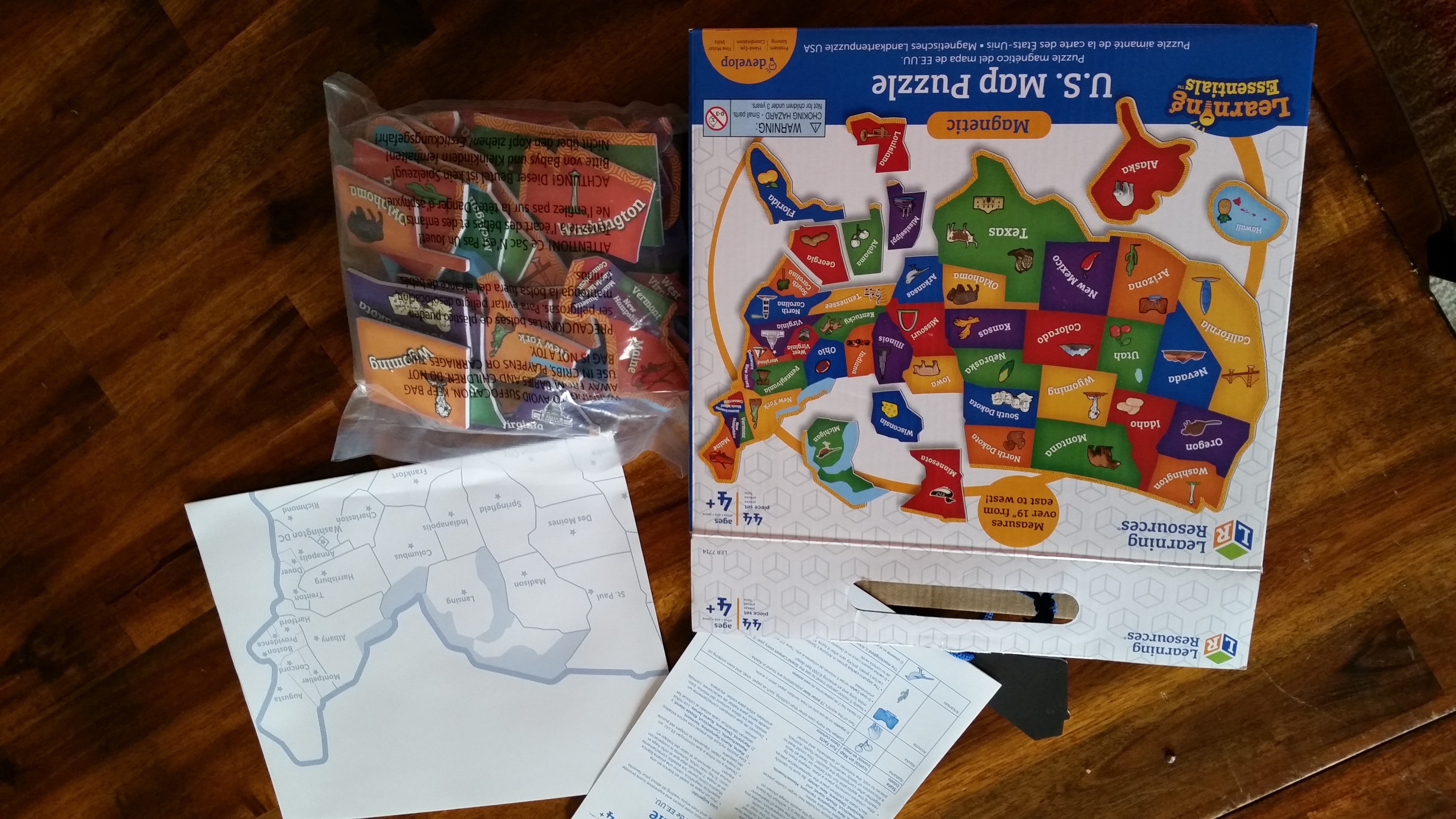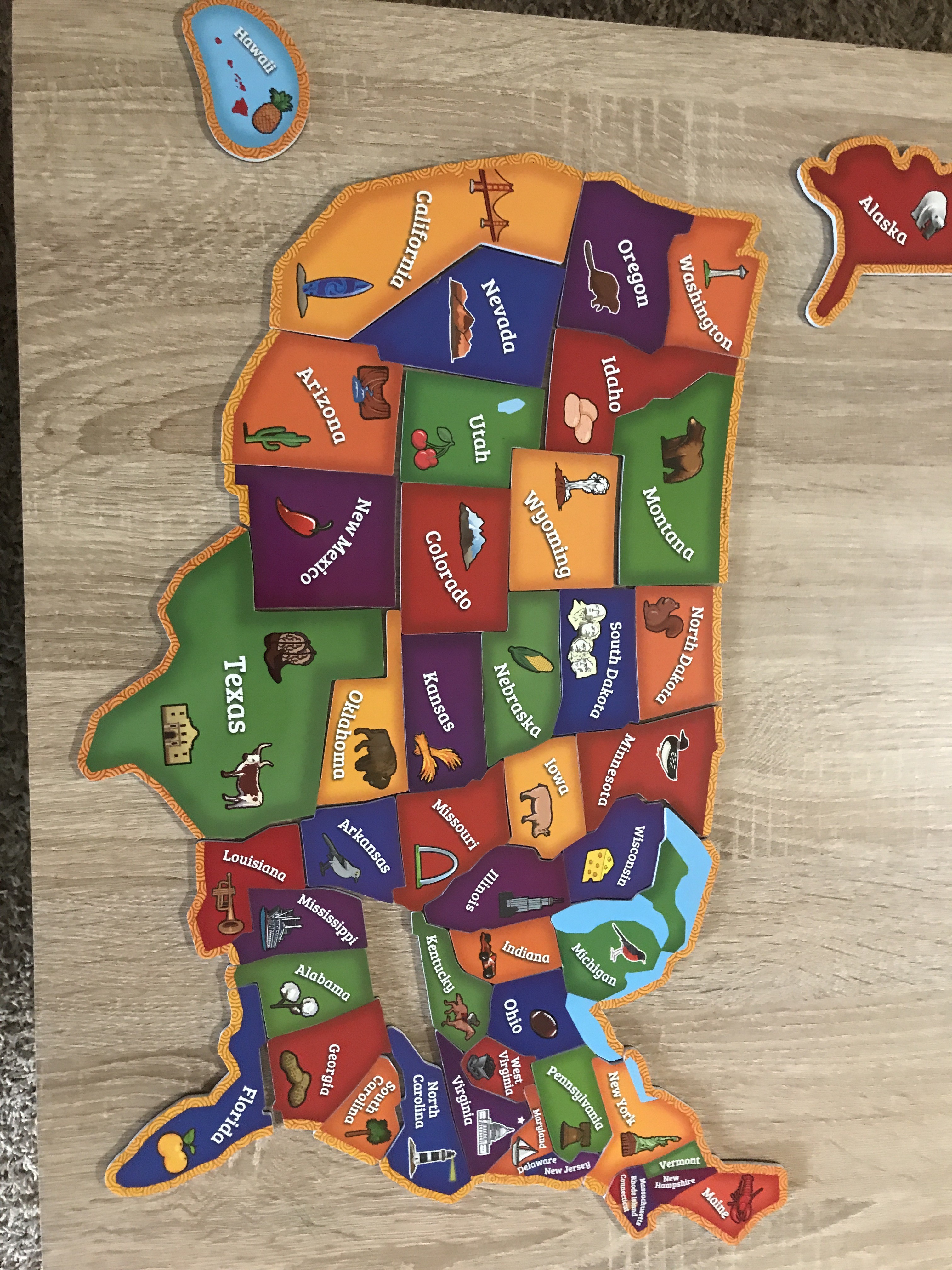 I purchased this for my 3 year old granddaughter and honestly wanted to put it together myself also! We love it as a family! It wouldn't fit in my refrigerator and it didn't work well wth the paper outline laying on table so I got creative!!! I purchased a magnetic dry erase board the same size and used modge podge (glue) and glued the outline to the board and smoothed out all the wrinkles and bubbles!! And let me tell ya we not only have a beautiful puzzle but with the bright colors looks like a work of art!! It hangs in my granddaughter's playroom and is easily removed to put together anytime!! Not stashed away in a box and forgotten about! I love that the outline is there and capitals of all the states readily to learn!! Everyone in our house loves this puzzle and great grandparents even liked it when they visited!! So great for ages 3-76!!! Learning Resources never ceases to amaze me with the great products!! I absolutely love shopping for things that help her learn all while she feels she is just playing!! Definitely worth the money and such sturdy quality!