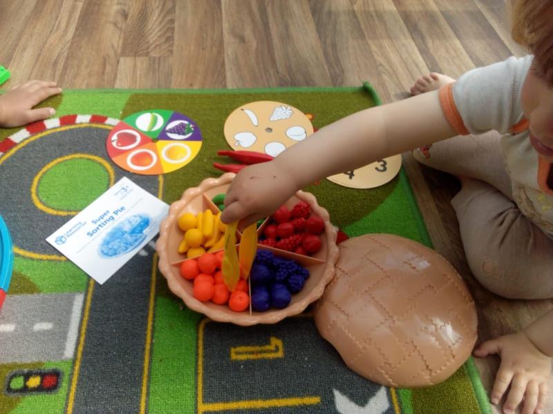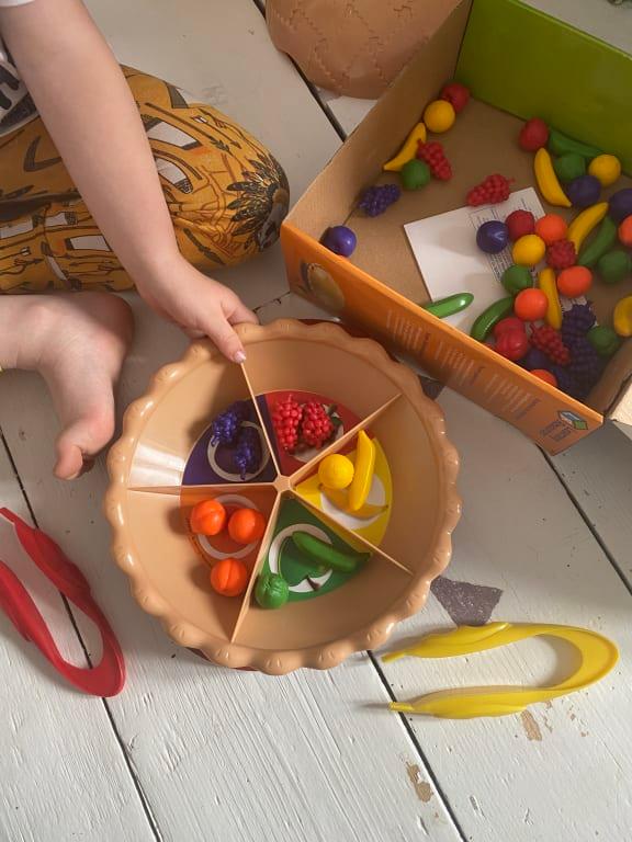 Absolutely love this pie, loads of ways to sort using colour, shape or numbers. The tongs provided also help develop a child's hand /eye coordination. My son has had hours sorting, lining up and counting the fruits. Grouping in size and lining up in patterns. So many ways to use and easy to store away after play with the pie's lid.