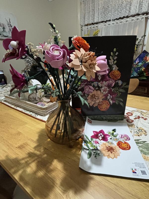 At first it seemed like a daunting task but then I was having fun building and loved how this bouquet of flowers came out. Some pieces had a different color than but the color was supposed to. E and the hardest flower was the orange one because of the many pedals but I suggest having fun with it and rewarding your self with some me time with this set.