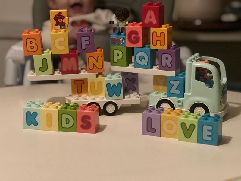 The LEGO Alphabet Truck is a toy that can help toddlers learn the alphabet through creative building and imaginative play. It includes a truck with a trailer, figurines, and a brick for each letter of the alphabet. Toddlers can improve their fine motor skills by stacking the letter bricks onto the back of the truck.