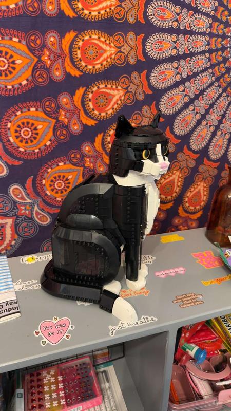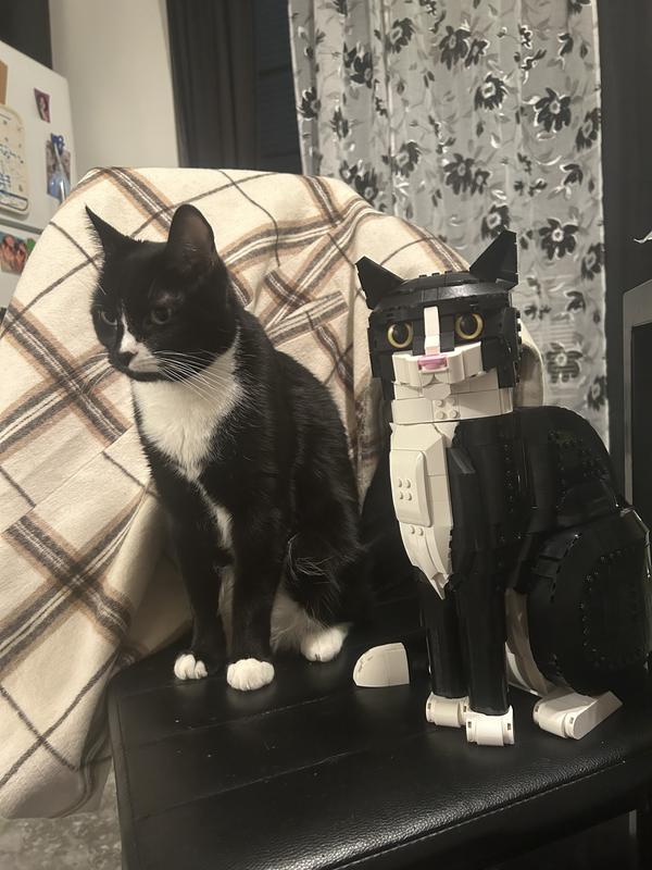 I’m absolutely thrilled with this set. The design is incredibly well thought out, from the proportions to the color placement. The black-and-white contrast is clean and accurate, and the face has so much personality without being overdone. It genuinely captures the look and posture of a real tuxedo cat. The build process was enjoyable and smooth. It’s detailed enough to stay interesting the entire time, but not so complex that it becomes frustrating. Everything comes together in a very satisfying way, and the finished model feels decently sturdy and pretty well-balanced as long as its on a solid platform of course. Once completed, it looks fantastic as a display piece. It’s instantly recognizable, and the overall shape and expression give it a surprisingly lifelike presence. Seeing it next to a real cat really highlights how accurate and charming the design is. This is an excellent set for both LEGO fans and cat lovers. It’s fun to build, looks great on display, and clearly had a lot of care put into the design. I would absolutely recommend it and would happily purchase similar animal builds in the future.