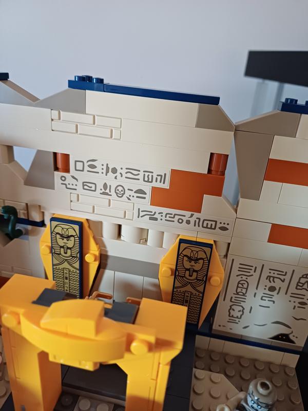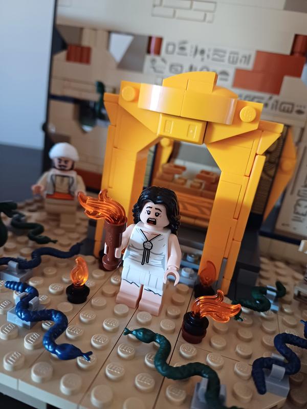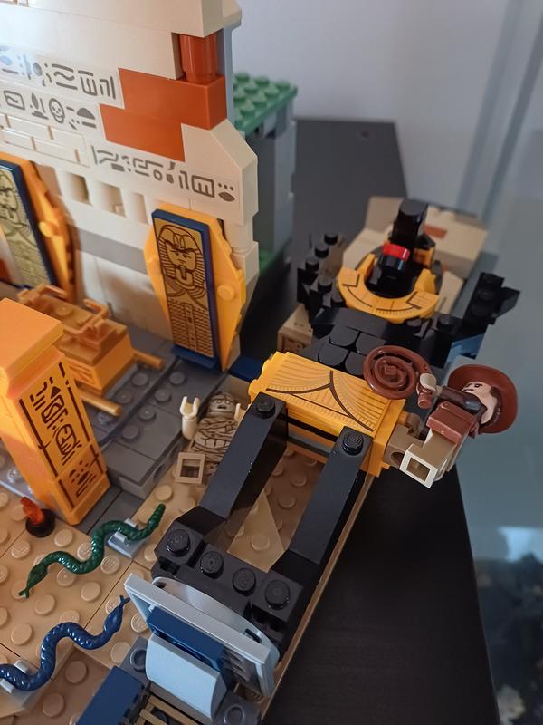 I'll get my one criticism with this set out of the way fast. It's difficult to move the set around without the collapsable falling down depending on the angle the set is held at. The Anubis statue has a similar issue, but the structure of its build and its position in the set means it's less likely to break from its own weight not being supported by a surface under the set. That being said, I really like this set otherwise! The Well of Souls (call it a tomb all you like, we know what it is) is a nice update to the original set with even more detail to it and the possibility to extend it if one had the bricks for it. The brick selections? A perfect choice of colors and textures to recreate the ruins, with the hieroglyphics decals bringing to mind not only the original set, but also Pharaoh's Quest and the Adventurers theme, plus the R2-D2 and C-3PO cameos make a nice return. The Anubis statues look much more like the movie and better convey the size of the place, unlike the original set, which was much smaller. The Ark makes a wonderful return to LEGO after only being a gold treasure chest in most of the old Raiders sets, with the smaller but still identifiable appearance and details looking very good. The minifigures are also very nice. Marion Ravenwood gets a very good overhaul in terms of design, complete with dual-printed legs and a new hair piece closer to her style in the movie. Indy is fine as well, with the torso from the Golden Idol temple, but the head from the Fighter Plane Chase. Sallah finally gets his own minifigure after being a game-only character for years, and he looks great. The mummy is decently detailed. There's nothing wrong with the design, and there were mummies in the movie, but it really doesn't feel especially needed for the set. Still a good addition regardless.