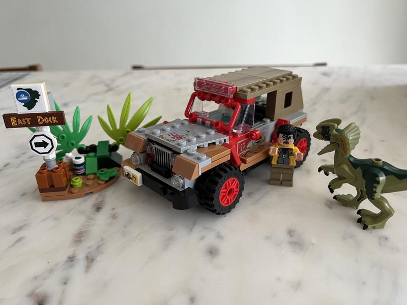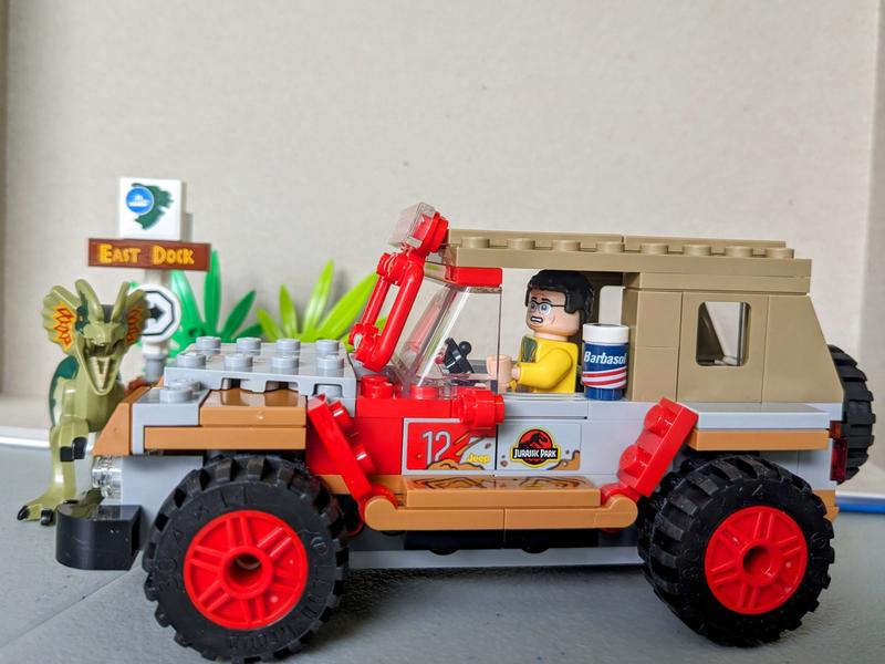 I love the look of this set, the Dilophosaurus figure is amazing and the print detail is spot on, the side build of the East Dock sign is amazing with the added feature of it being able to fall down and have the sign spin like in the film scene. the Jeep looks especially good with all the detail packed into it such as a more muddy look along with various Jurassic Park logos and identification numbers. one downside however is that this detail is applied with stickers instead of prints. The box art is amazing with the T-rex on the side of the box, the box is much bigger than expected but it looks amazing. Amazing value for money and i would rate it a 10/10