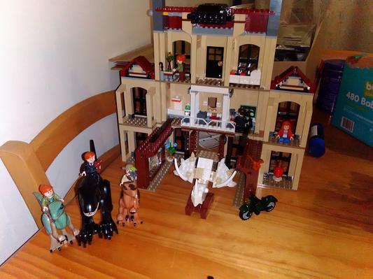 Building wasn't so bad and seeing all the features was REALLY cool and it didn't take me that long, which is GOOD, and I got for my birthday. So, at first I built it and dada sorted out the pieces, aaaand um after days and days and days Lockwood Estates isn't torn down yet, so... My friend mason really wants to tear it down, he likes to look at the stuff like the motorcycle. He doesn't really like dinosaurs. There's a hiding under the bed feature and that's everything! And I'm five years old.