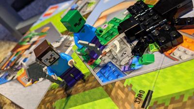 Okay this set is great! Great minifigs and mobs, build is awesome. The play feature is great however, the gravel tends to fall when you pick up the set or move it slightly which is kinda annoying. I was able to connect this set to a Minecraft polybag (The Skeleton Defense) and also another minecraft set (The Taiga Adventure), making it look like a Minecraft world. Minifigs are good, I didn’t have a zombie yet. Steve is sort of boring since he’s basically in every minecraft set, so is alex. I think lego should make more different minifigs in Minecraft, not just Steve and Alex. Well the build was great I love the mini slime and the spider, the crafting table and the ores are great. I think this set maybe should’ve came with a furnace so he can smelt the ore or maybe instead of the crafting table it could have came with a furnace. I had some trouble connecting this to my other Minecraft sets so I had to use two 2x2 bricks from my collection to help. The price for piece ratio is great on this set especially if you get it on sale like I did. Overall an amazing set and a must-have in Minecraft sets as it comes with many ores and mobs. I really recommend this set especially since this may retire soon!