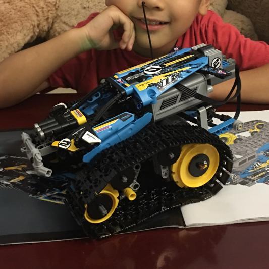 This one has some fundamental structure flaws, like the rear wheelie wheels are so flimsily set they come off constantly. So does the control block which is set with just two black pins to the back of the body. There is too much torque on the drive train to keep the front wheel assembly from crumbling during play and this thing does not survive crashes. We were constantly fixing it until I decided to lock the weak points in place with super glue. This is not how a working lego toy should be made. On the other hand, its appropriately powered for an RC lego Toy, unlike a certain race car.... and when not broken its a gas.