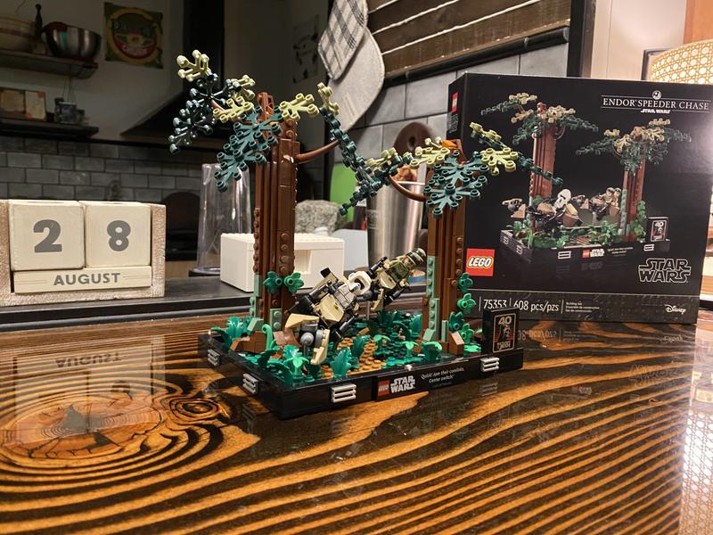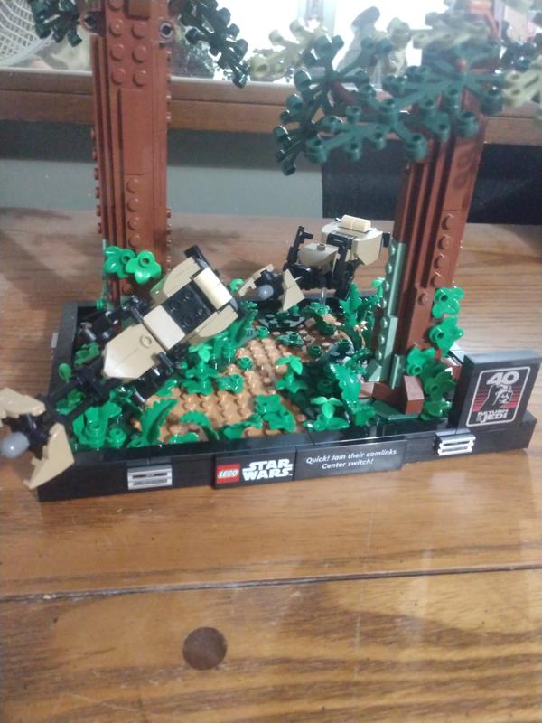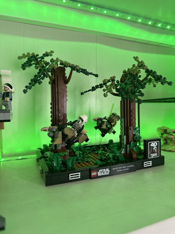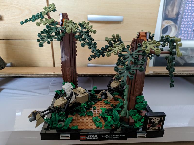 This set looks very good on display, I know some people complain about the trees’ instability but that’s actually correct to life (Muir Woods, where this scene was filmed, has mainly redwood trees which are very fragile-I’ve been there many times) and also about the speeders’ steep angle, but look at the movie, they’re going pretty fast and weaving at angles like this. Also as for the photos, some people say it’s not the same, but it is if you look at it with your eyes level to the base. That’s how the photo was taken, clearly. I know that there are a lot of Lego Star Wars sets that are underwhelming or plain bad, but this is, in my opinion, one of the good ones. Keep doing dioramas and stuff like this, Lego, and you’ll keep your fans. But please stop downsizing literally everything. Thanks!